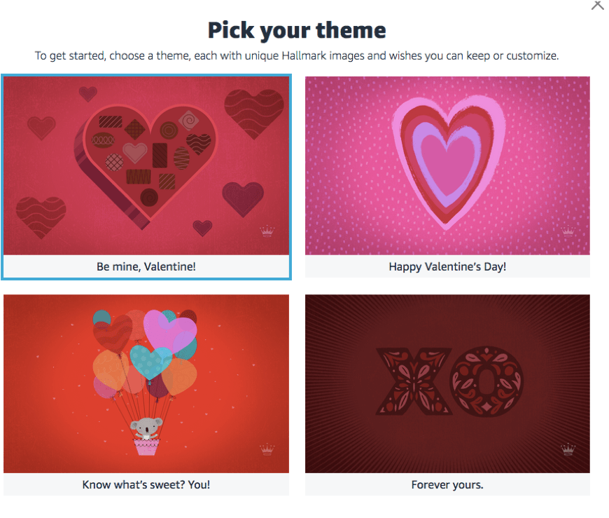 I also led creative content and the audio strategy on Amazon’s first co-branded blueprint skills, Hallmark Greetings Blueprints. Our Valentine’s blueprint was shared to other users more than any other blueprint during the week of Valentines and our card blueprints were more popular than other greeting card skills offered.
